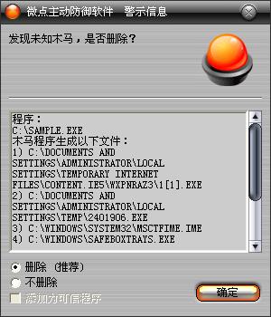 已安装使用微点主动防御软件的用户,无须任何设置,微点主动防御将自动保护您的系统免受该病毒的入侵和破坏。无论您是否已经升级到最新版本,微点主动防御都能够有效清除该病毒。如果您没有将微点主动防御软件升级到最新版,微点主动防御软件在发现该病毒后将报警提示您发现“未知木马”,请直接选择删除处理(如图1)