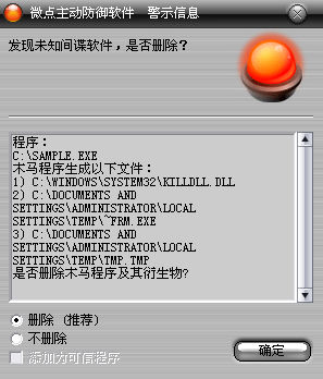 图1 微点主动防御软件自动捕获未知病毒(未升级)
