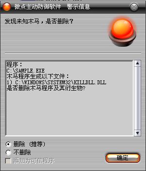 图1 微点主动防御软件自动捕获未知病毒(未升级)