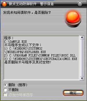 图1 微点主动防御软件自动捕获未知病毒(未升级)