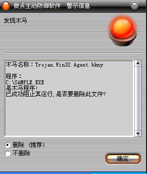 如果您已经将微点主动防御软件升级到最新版本,微点将报警提示您发现木马"Trojan.Win32.Agent.bkny”,请直接选择删除(如图2)。