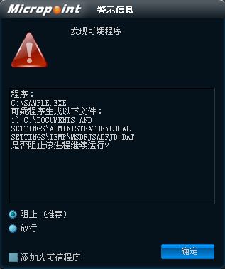 已安装使用微点主动防御软件的用户,无须任何设置,微点主动防御将自动保护您的系统免受该病毒的入侵和破坏。无论您是否已经升级到最新版本,微点主动防御都能够有效清除该病毒。如果您没有将微点主动防御软件升级到最新版,微点主动防御软件在发现该病毒后将报警提示您发现“可疑程序”,请直接选择删除处理(如图1)