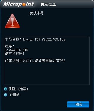 如果您已经将微点主动防御软件升级到最新版本,微点将报警提示您发现木马"Trojan-PSW.Win32.WOW.lba”,请直接选择删除(如图2)。