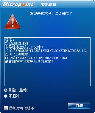 已安装使用微点主动防御软件的用户,无须任何设置,微点主动防御将自动保护您的系统免受该病毒的入侵和破坏。无论您是否已经升级到最新版本,微点主动防御都能够有效清除该病毒。如果您没有将微点主动防御软件升级到最新版,微点主动防御软件在发现该病毒后将报警提示您发现“未知木马”,请直接选择删除处理(如图1)