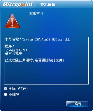 如果您已经将微点主动防御软件升级到最新版本,微点将报警提示您发现木马"Trojan-PSW.Win32.QQPass.pkk ”,请直接选择删除(如图2)。