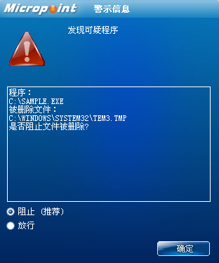 已安装使用微点主动防御软件的用户,无须任何设置,微点主动防御将自动保护您的系统免受该病毒的入侵和破坏。无论您是否已经升级到最新版本,微点主动防御都能够有效清除该病毒。如果您没有将微点主动防御软件升级到最新版,微点主动防御软件在发现该病毒后将报警提示您发现“可疑程序”,请直接选择删除处理(如图1)