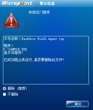 如果您已经将微点主动防御软件升级到最新版本,微点将报警提示您发现木马"Backdoor.Win32.Agent.a”,请直接选择删除(如图2)。