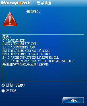已安装使用微点主动防御软件的用户,无须任何设置,微点主动防御将自动保护您的系统免受该病毒的入侵和破坏。无论您是否已经升级到最新版本,微点主动防御都能够有效清除该病毒。如果您没有将微点主动防御软件升级到最新版,微点主动防御软件在发现该病毒后将报警提示您发现“未知木马”,请直接选择删除处理(如图1)