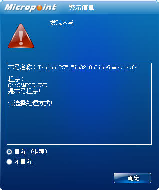 如果您已经将微点主动防御软件升级到最新版本,微点将报警提示您发现木马"Trojan-PSW.Win32.OnLineGames.esfr”,请直接选择删除(如图2)