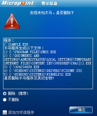 已安装使用微点主动防御软件的用户,无须任何设置,微点主动防御将自动保护您的系统免受该病毒的入侵和破坏。无论您是否已经升级到最新版本,微点主动防御都能够有效清除该病毒。如果您没有将微点主动防御软件升级到最新版,微点主动防御软件在发现该病毒后将报警提示您发现“未知木马”,请直接选择删除处理(如图1)