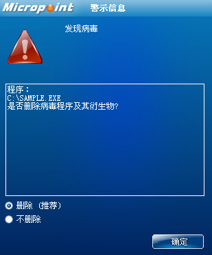 已安装使用微点主动防御软件的用户,无须任何设置,微点主动防御将自动保护您的系统免受该病毒的入侵和破坏。无论您是否已经升级到最新版本,微点主动防御都能够有效清除该病毒。如果您没有将微点主动防御软件升级到最新版,微点主动防御软件在发现该病毒后将报警提示您“发现病毒”,请直接选择删除处理(如图1)