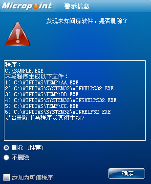 已安装使用微点主动防御软件的用户,无须任何设置,微点主动防御将自动保护您的系统免受该病毒的入侵和破坏。无论您是否已经升级到最新版本,微点主动防御都能够有效清除该病毒。如果您没有将微点主动防御软件升级到最新版,微点主动防御软件在发现该病毒后将报警提示您发现“未知间谍软件”,请直接选择删除处理(如图1)