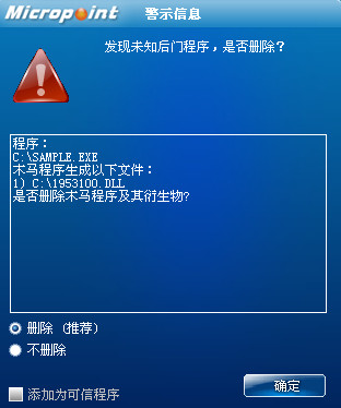 已安装使用微点主动防御软件的用户,无须任何设置,微点主动防御将自动保护您的系统免受该病毒的入侵和破坏。无论您是否已经升级到最新版本,微点主动防御都能够有效清除该病毒。如果您没有将微点主动防御软件升级到最新版,微点主动防御软件在发现该病毒后将报警提示您发现“未知木马”,请直接选择删除处理(如图1)