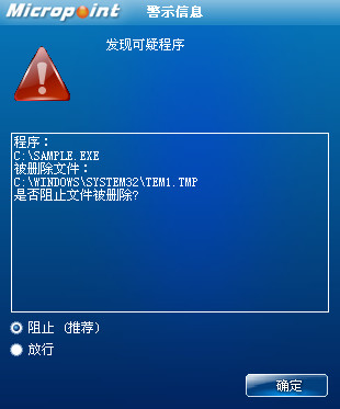 已安装使用微点主动防御软件的用户,无须任何设置,微点主动防御将自动保护您的系统免受该病毒的入侵和破坏。无论您是否已经升级到最新版本,微点主动防御都能够有效清除该病毒。如果您没有将微点主动防御软件升级到最新版,微点主动防御软件在发现该病毒后将报警提示您“发现可疑程序”,请直接选择阻止处理(如图1)
